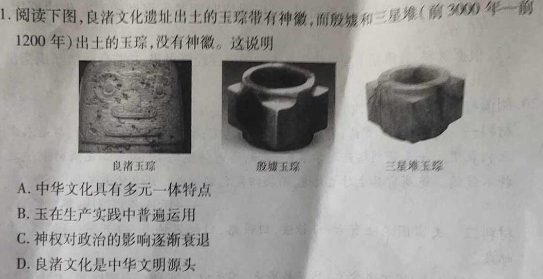 1.阅读下图,良渚文化遗址出土的玉琮带有神徽,而殷和三星堆(前3000年一前1200年)出土的玉琮,没有神徽。这说明A.中华文化具有多元一体特点B.玉在生产实践中普遍运用C.神权对政治的影响逐渐衰退D.良渚文化是中华文明源头