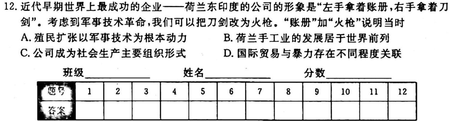 12.近代早期世界上最成功的企业——荷兰东印度的公司的形象是“左手拿着账册,右手拿着刀剑”。考虑到军事技术革命,我们可以把刀剑改为火枪。“账册”加“火枪”说明当时A.殖民扩张以军事技术为根本动力B.荷兰手工业的发展居于世界前列C.公司成为社会生产主要组织形式D.国际贸易与暴力存在不同程度关联班级姓名分数