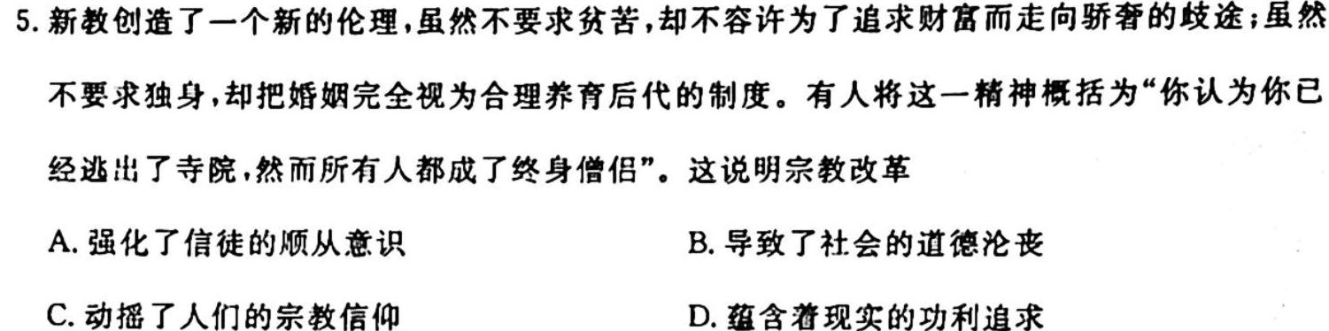 5.新教创造了一个新的伦理,虽然不要求贫苦,却不容许为了追求财富而走向骄奢的歧途;虽然不要求独身,却把婚姻完全视为合理养育后代的制度。有人将这一精神概括为“你认为你已经逃出了寺院,然而所有人都成了终身僧侣”。这说明宗教改革A.强化了信徒的顺从意识B.导致了社会的道德沦丧C.动摇了人们的宗教信仰D.蕴含着现实的功利追求