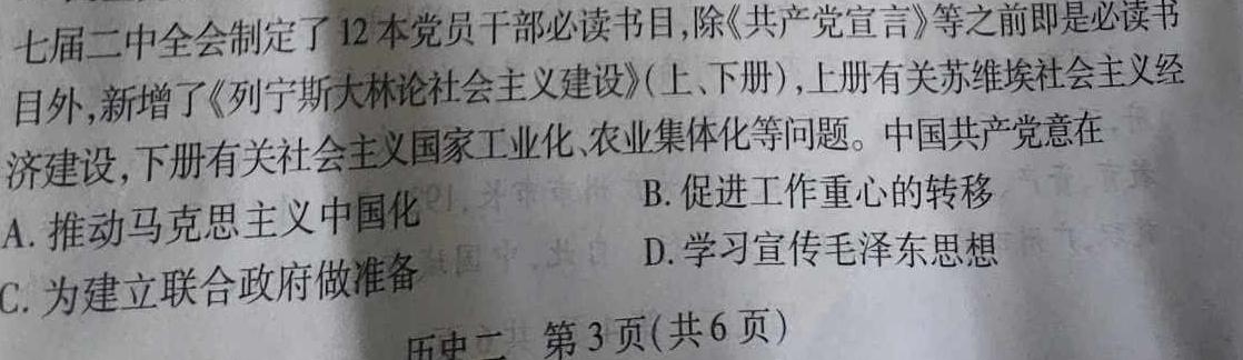 13.七届二中全会制定了12本党员干部必读书目,除《共产党宣言》等之前即是必读书目外,新增了《列宁斯大林论社会主义建设》(上、下册),上册有关苏维埃社会主义经济建设,下册有关社会主义国家工业化、农业集体化等问题。意在B.促进工作重心的转移A.推动中国化D.学习宣传毛泽东思想C.为建立联合政府做准备