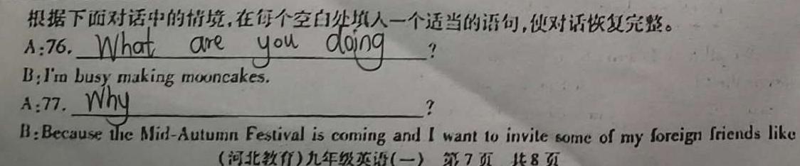根据下面对话中的情境,在每个空白处填人一个适当的语句,使对话恢复完整,A:76.Whatareyoudoing?B:Im busy makmoon cakes.A.7A:77. why ?____B:Because the Mid-Autumn Festival is coming and I want to invite some of my foreign friends likeThe Most Beautiful HeroEveryone has his own hero. Now I want to talk about the hero in my mind.I think Yuan2ongpisthebestheroinmymind Heisa greatChinesescientist.Hegrewanewkindrice calledmybrid rice.____