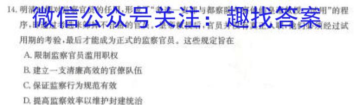14.明清时期对监察官员的任用,形成了“考选一吏部与都察院考察他们皇帝敕授一试用”的程序,即通过考选来筛掉不合格的官员。皇帝敕授后,官员并没有真正人职,他们必须经过试用期的考验,最后才能成为正式的监察官员。这些规定旨在A.限制监察官员滥用职权B.建立一支清廉高效的官镶队伍C.保证监察行为规范有效D.提高监察效率以维护封建统治