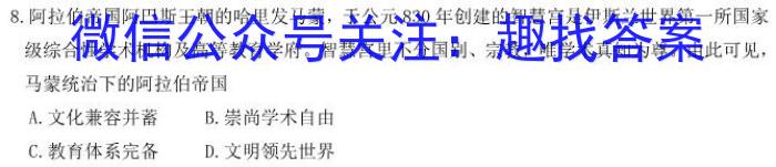 8.阿拉伯帝国的哈里发马蒙,于公元830年创建的智慧宫是伊斯兰世界第一所国家级综合性学术机构及高等教育学府。智慧宫里不分国别、宗教,唯学术真知为尊。由此可见,马蒙统治下的阿拉伯帝国A.文化兼容并蓄B.崇尚学术自由C.教育体系完备D.文明领先世界