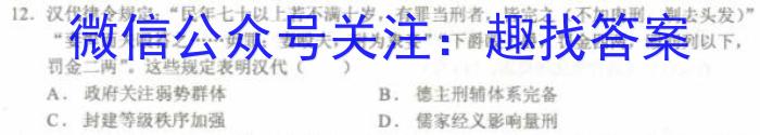 12.汉代律令规定:“民年七十以上若不满十岁,有罪当刑者,皆完之(不加肉刑,剃去头发)”“妻悍而夫殴答之……毋罪;妻殴夫,耐为隶妾”“下爵殴上爵,罚金四两,殴同列以下,罚金二两”。这些规定表明汉代()A.政府关注弱势群体B.德主刑辅体系完备C.封建等级秩序加强D.儒家经义影响量刑