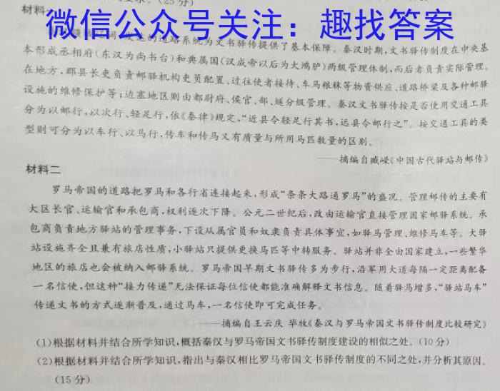 17.阅读材料,完成下列要求。(25分)材料一秦汉疆域辽间,发达的道路系统为文书驿传提供了基本保障,秦汉时期,文书驿传制度在中央基本形成丞相府(东汉为尚书台)和典属国(汉成帝以后为大鸿驴)两级管理体制,而后者负责实际管理,在地方,郑县长更负责邮驿机构史员配置、过往使者接待,车马等物资应梁及各种邮硫设施的维修保护等;边塞地区则山都尉府、候官,部,分级管理,秦汉文书驿传按是否使用交通工具分为以邮行,以次行、轻足行,依《秦律》规定,“近县今轻足行书,远具今邮行之”按交通工具的类型则可分为以车行、以马行,传车和传马又有质量与所用马匹教量的区别。摘编自减C中国古代驿站与邮玲》罗马帝国的道路把罗马和各行省连接起来,形成“条条大路通罗马”的盛况。管理邮传的主要有大区长官、运输官和承包商,权利逐次下降,公元二世纪后,改由运输官直接管理国家邮驿系统,承包商负地方驿站的管理事务,下设从属官员和奴隶负青具体事宜,如驿马管理、单修马车等。大驿站设施齐全具兼有旅店性质,小驿站只提供更换马匹等中转服务。驿站并非全由国家建立,一些繁华地区的旅店也会被纳入邮驿系统罗马帝国早期文书驿传多为步行,沿军用大道每隔一定距离配备名,但这种“接力传递”无法保证毎位使都能准确解释文书信息。随着驿马增多,“驿站马车”传递文书的方式逐渐普及,通过马车,一名信使即可完成任务。摘编自王云庆毕牧《秦汉与罗马帝国文书驿传制度比较研究》(1)根据材料并结合所学知识,概括秦汉与罗马帝国文书驿传制度建设的相似之处。(10分)(2)根据材料并结合所学知识,指出与秦汉相比罗马帝国文书驿传制度的不同之处,并分析其原因。(15分)