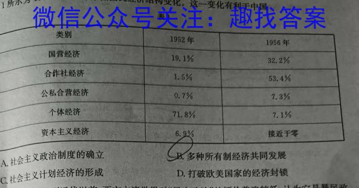 11.表1所示为1952一1956年中国国民经济结构变化,这一变化有利于中国于中国表1A.社会主义政治制度的确立B.多种所有制经济共同发展C.的形成D.打破欧美国家的经济封锁