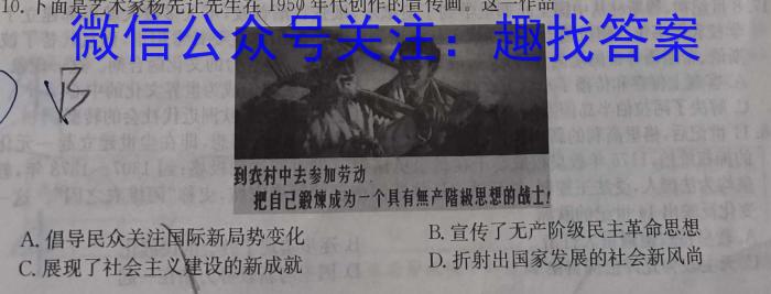 10.下面是艺术家杨先让先生在1950年代创作的宣传画。这一作品DB到农村中去参加劳动把自己鍛東成为一个具有無产階級思想的战士!B.宣传了无产阶级民主革命思想A.倡导民众关注国际新局势变化D.折射出国家发展的社会新风尚C.展现了社会主义建设的新成就