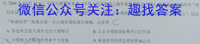 15.2004年10月14日,中国与俄罗斯发表《中华人民共和国与俄罗斯联邦联合声明》,明确提出中俄两国“愿同各国一道,为建立一个和平、发展、和谐的世界,实现公正合理的国际政治经济新秩序而不懈努力”,这是“和谐世界”的观点第一次出现在国际政治领域。这表明CA.多边外交是大国外交的主要特点B.公正合理的国际秩序已经形成C.中国致力于推动世界和平与发展D.和谐世界的理念得到普遍认同