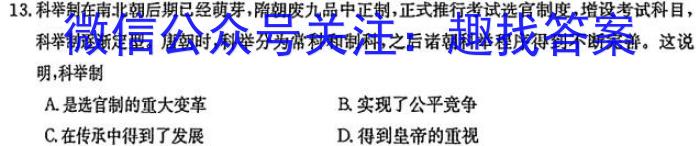 13.科举制在南北朝后期已经萌芽,隋朝废九品中正制,正式推行考试选官制度,增设考试科目,科举制逐渐定型。唐朝时,科举分为常科和制科,之后诸朝科举程序得到不断完善。这说明,科举制A.是选官制的重大变革B.实现了公平竞争C.在传承中得到了发展D.得到皇帝的重视