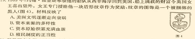 19.1565年,约翰·霍金斯率领他的船队从西非海岸回到英国,船上满载的财富令英国女王喜出望外。女王专门授给他一块盾形纹章作为奖励,纹章的图饰是一个被捆绑的黑人(图4)。材料反映了A.美洲文明逐渐走向衰弱B.资本来源的多样性C.资本原始积累充满血腥D.殖民制度的正当性