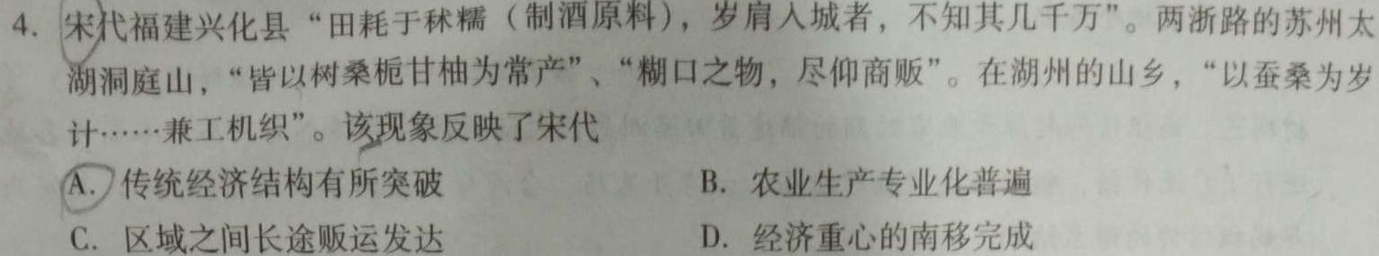 4.宋代福建兴化县“田耗于糯(制酒原料),岁肩人城者,不知其几千万”。两浙路的苏州太湖洞庭山,“皆以树桑栀甘柚为常产”、“糊口之物,尽仰商贩”。在湖州的山乡,“以蚕桑为岁计……兼工机织”。该现象反映了宋代A.传统经济结构有所突破B.农业生产专业化普遍C.区域之间长途贩运发达D.经济重心的南移完成