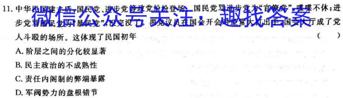 11.中华民国建立后,国民党、进步党等政党纷纷登场。国民党骂进步党为“官僚党”,喋蝶不休;进步党骂国民党为“暴民党”,没完没了。两党议员在国会开会时经常大打出手,国会大厅成了党人斗殴的场所。这体现了民国初年()A.阶层之间的分化较显著B.民主政治的不成熟性C.责任内阁制的弊端暴露D.军阀势力的盘根错节