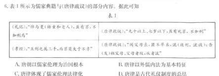 6.表1所示为儒家典籍与(唐律疏议)的部分内容。据此可知表1A.唐朝以儒家伦理为治国根本B.唐律以外儒内法为基本特征C.唐律体现了儒家伦理法律化D.唐律是古代礼仪制度的总结