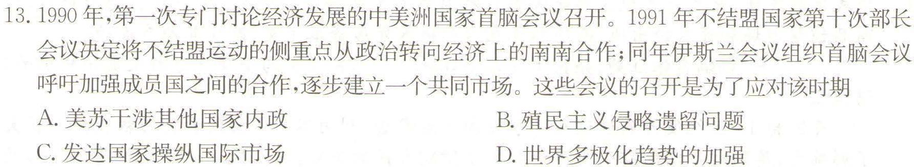 13.1990年,第一次专门讨论经济发展的中美洲国家首脑会议召开。1991年不结盟国家第十次部长会议决定将不结盟运动的侧重点从政治转向经济上的南南合作;同年伊斯兰会议组织首脑会议呼吁加强成员国之间的合作,逐步建立一个共同市场。这些会议的召开是为了应对该时期A.美苏干涉其他国家内政B.殖民主义侵略遗留问题C.发达国家操纵国际市场D.世界多极化趋势的加强