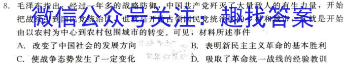 8.指出:经过一年多的战略防御,歼灭了大量敌人的有生力量,开始把战线引到国民党统治区,也就是开始占领国民党统治区的乡村和城市,这就是开始由以农村为中心到农村包围城市的转变。可见,材料所述事件A.改变了中国社会的发展方向B.表明新民主主义革命的基本胜利C.使战争态势发生了一定变化D.吸取了革命统一战线的经验教训