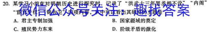 20.某学习小组在对明朝历史进行探究时、记录了“洪武十三年罢丞相不设”“内阁”“宦官专权”“锦衣卫”四项内容,从中可以看出其研究的主题是A.加强B.国家域的奠定C.殖民势力东来D.阶级矛盾的激化