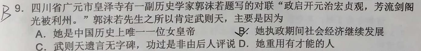 B9.四川省广元市皇泽寺有一副历史学家郭沫若题写的对联“政启开元治宏贞观,芳流剑阁光被利州。”郭沫若先生之所以肯定武则天,主要是因为A.她是中国历史上唯一一位女皇帝B:她执政期间社会经济继续发展C.武则天遗言无字碑,功过是非由后人评说D.她重用有才能的人