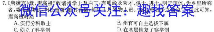 7.《唐摭言》载,唐高祖“敕诸州学士及白丁,有明经及秀才、俊士、进士,明于理体,为乡里所称者,委本县考试,州长重覆,取其合格,每年十月随物人贡。斯我唐贡士之始也”。由此可知,唐高祖时期A.实行分科取士B.州官可自主选拔下属C.创立了科举制D.在基层恢复了察举制