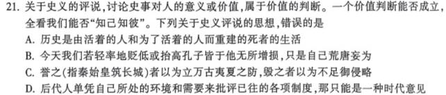 21.关于史义的评说,讨论史事对人的意义或价值,属于价值的判断。一个价值判断能否成立,全看我们能否“知己知彼”。下列关于史义评说的思想,错误的是A.历史是由活着的人和为了活着的人而重建的死者的生活B.今天我们若轻率地贬低或拾高孔子皆于他无所增损,只是自己荒唐妄为C.誉之(指秦始皇筑长城)者以为立万古夷夏之防,毁之者以为不足御侵略D.后代人单凭自己所处的环境和需要来批评已往的各项制度,那只能是一种时代意见