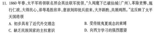 11.1860年春,太平军将领联名照会英法联军统领,“久闻麾下已破仙城(广州),革除吏弊,施行仁政,大得民心,弟等易胜欣幸,意欲刻即统兵前来,大齐斟酌,共展鸿图。”这反映了太平天国将领A.初步具有了近代外交理念B.受传统夷夏观念的束缚C.缺乏民族国家的主权意识D.向西方学习的强烈愿望