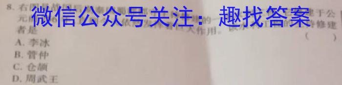 16.我国国庆节当日,设北京时间14:00时a地太阳高度为ha1,b地太阳高度为hb1;北京时间15:00时a地太阳高度为ha2,b地太阳高度为hb2,,则①hal>hbl②hal 8.右图是战国后期秦国蜀都都守主持修建的一项水利工程,它修建于公者是元前256年,直到今天依然发挥着巨大作用。该水利工程的主持修建大()A.李冰B.管仲C.仓颉D.周武王 郑重声明:本文版权归原作者所有,转载文章仅为传播更多信息之目的,如作者信息标记有误,请第一时间联系我们修改或删除,多谢。