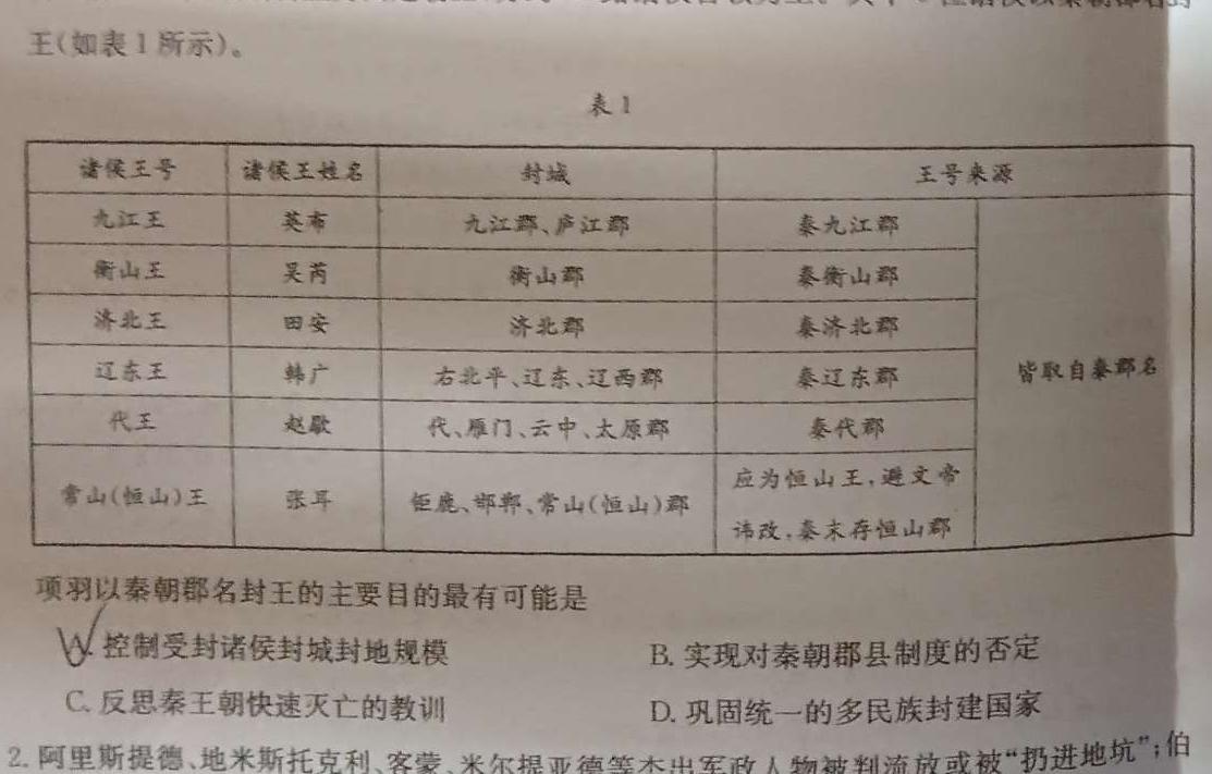 1.公元前206年、项羽自立为西楚霸王,分封18路诸侯首领为王。其中6位诸侯以秦朝郡名封王(如表1所示)。项羽以秦朝郡名封王的主要目的最有可能是控制受封诸侯封城封地规模B.实现对秦朝郡县制度的否定C.反思秦王朝快速灭亡的教训D.巩固统一的多民族封建国家