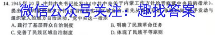 14.1945年10月,书记处发出《关于内蒙工作方针给晋察冀中央局的指示》.提出:“对内蒙的基本方针,在目前是实行区城自治,首先从各旗开始,争取时间,放手发动与组织蒙人的地方自治运动,”这一指示A.践行了基层群众自治制度B.明确了民族革命任务C.完善了民族区域自治制度D.体现了民族平等原则