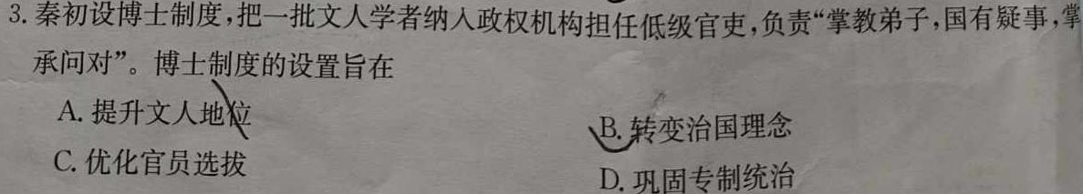 3.秦初设博,把一批文人学者纳人政权机构扣任低级官吏,负责“掌教弟子,国有疑事,掌承问对”。博士制度的设置旨在A.提升文人地位B.转变治国理念C.优化官员选拔D.巩固专制统治