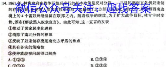 14.1861年,林肯政府在战争开始后奉行的基本政策是反对分裂……并且回避南方各州奴隶制的存废问题,拒绝黑人参加联邦军作战。这赢得了北方部分民主党人的支持,并使得西南边境上的4个蓄奴州继续留在联邦之内。随着战争的继续,为了扩大战争目标,林肯审时度势,颁布《解放黑人奴隶宣言》。由此可知,这一宣言的发表①推动了国家民主化进程②消除了南北分裂的根源③反映了奴隶制存废是南北方矛盾的焦点④具有务实的策略性⑤使种族歧视问题得以解决A.①②③B.①③④C.②③④D.②③⑤