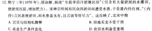 12.熙宁三年(1070年),侯叔献、杨汲“专提举沿汴淤溉民田”(引含有大量泥的水灌田,使淤泥沉淀,增加肥力)。宋种宗听闻有民众因淤田而遭受水患,于是遣内侍往视,“(内侍)言民甚便淤田,而水患盖无有,且言汲等皆尽力”。这反映了,北宋中期A.官员勾结徇私舞弊B.田地买卖不受干预C.农业生产条件恶化D.农田水利备受重视
