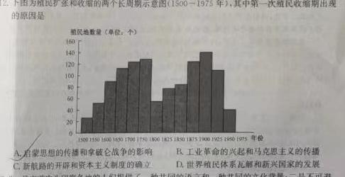 12.下图为殖民扩张和收缩的两个长周期示意图(15001975年),其中第一次殖民收缩期出现的原因是植民数量(单:个)015500016501N0IT51A.后蒙思想的传播和拿破仑战争的影响B.工业革命的兴起和的传播C.新航路的开辟和资本主义制度的确立D.世界殖民体系瓦解和新兴国家的发展