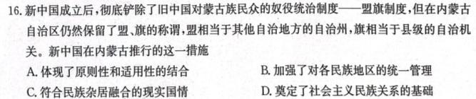 16.新中国成立后,彻底铲除了旧中国对蒙古族民众的奴役统治制度——盟旗制度,但在内蒙古自治区仍然保留了盟、旗的称谓,盟相当于其他自治地方的自治州,旗相当于县级的自治机关。新中国在内蒙古推行的这一措施A.体现了原则性和适用性的结合B.加强了对各民族地区的统一管理C.符合民族杂居融合的现实国情D.奠定了社会主义民族关系的基础